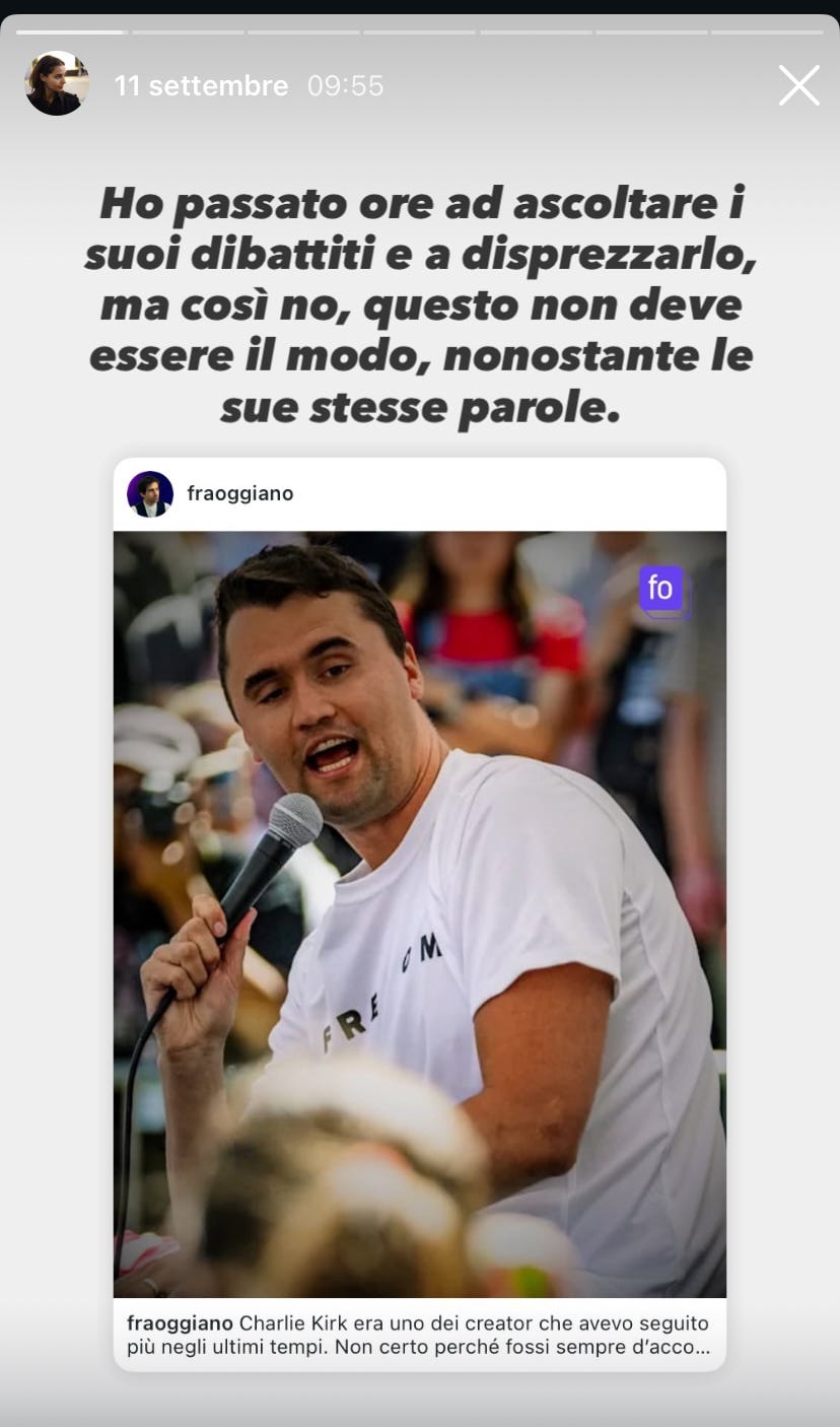 Ho passato ore ad ascoltare i suoi dibattiti, ad analizzare come comunicava, come rispondeva e come argomentava su posizioni estreme, mentre dalle persone che si confrontavano con lui ho imparato come tenere il punto, come rispondere alle provocazioni e a opinioni che considero disgustose e lontanissime dal mio modo di vedere il mondo. Ma nonostante il disprezzo che provo per le sue idee, trovo inaccettabile quello che gli è successo. È tragico e paradossale che Kirk sia stato vittima della stessa cultura delle armi che nel 2023 aveva definito “necessaria” per difendere il Secondo Emendamento.