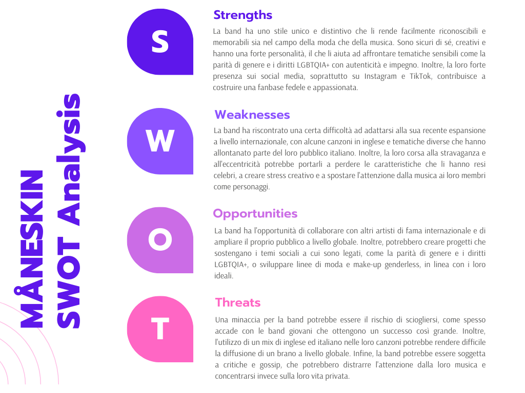 L'analisi SWOT dei Måneskin è uno strumento utile per comprendere i punti di forza, le opportunità, le debolezze e le minacce che la band affronta nell'ambito musicale. Questa analisi permette di identificare i fattori interni ed esterni che possono influenzare il successo della band e di individuare eventuali aree di miglioramento per sviluppare una strategia di comunicazione più efficace.